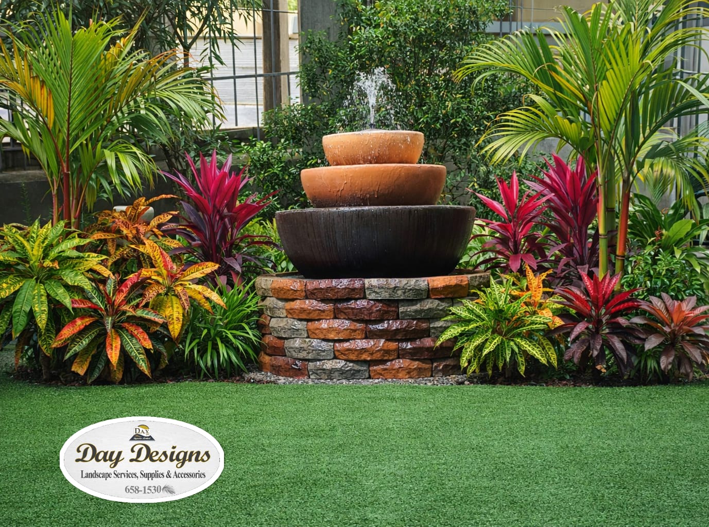 • Contrasting decorative landscaping blocks surround the base, enhancing texture and grounding the design naturally within the garden.