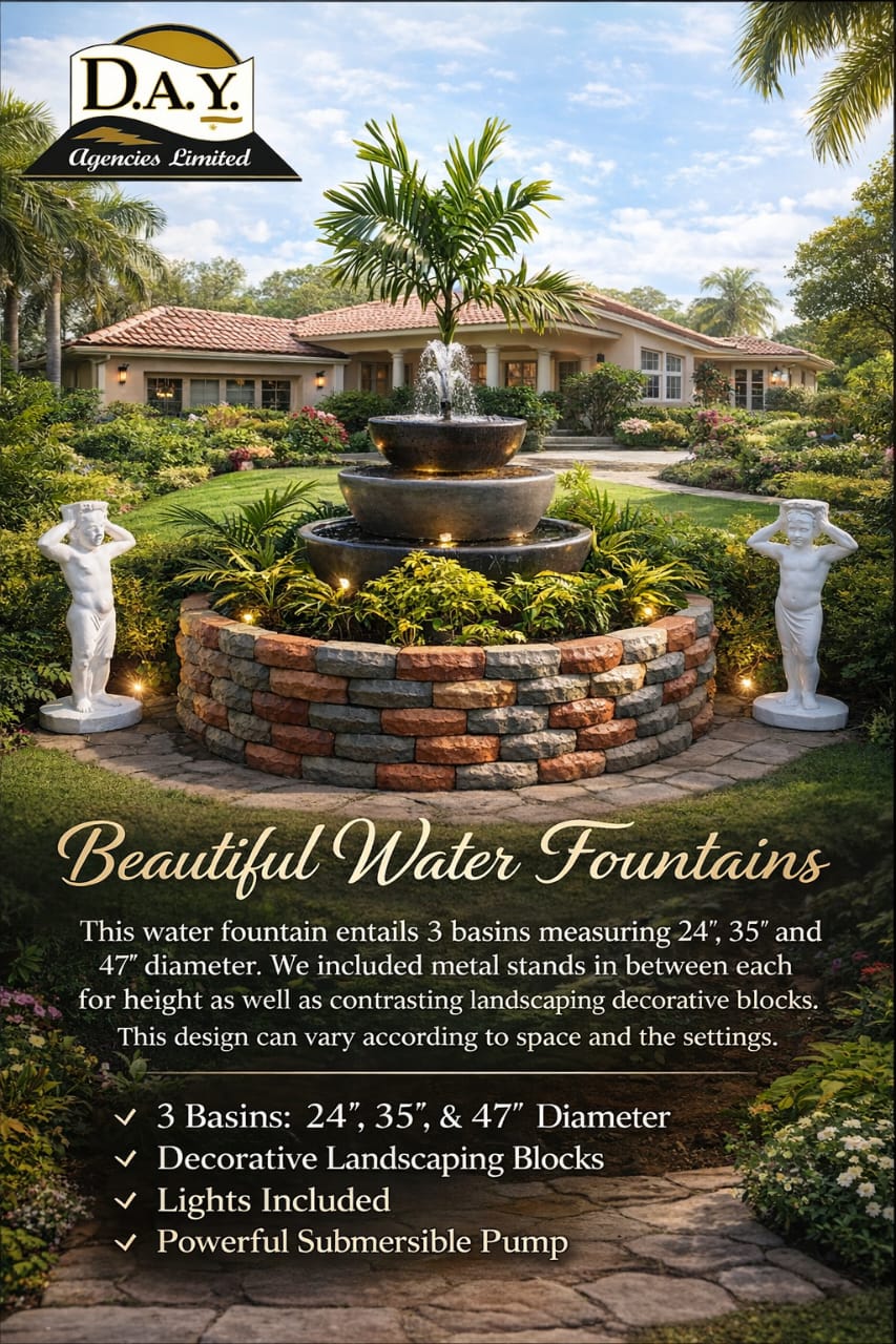 This elegant cascading water fountain features a three-basin design that creates a soothing flow of water and a striking visual centerpiece