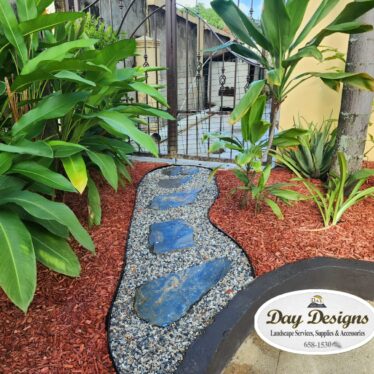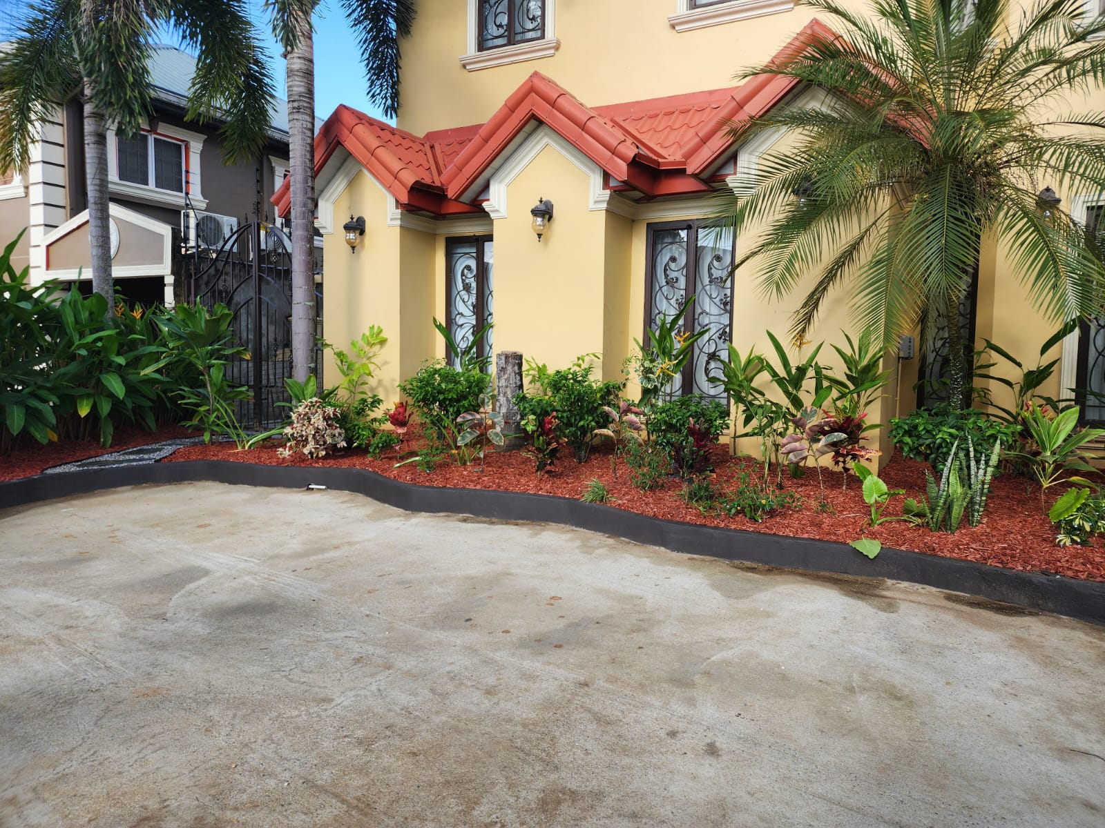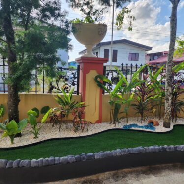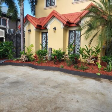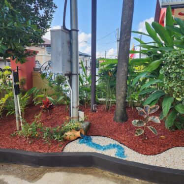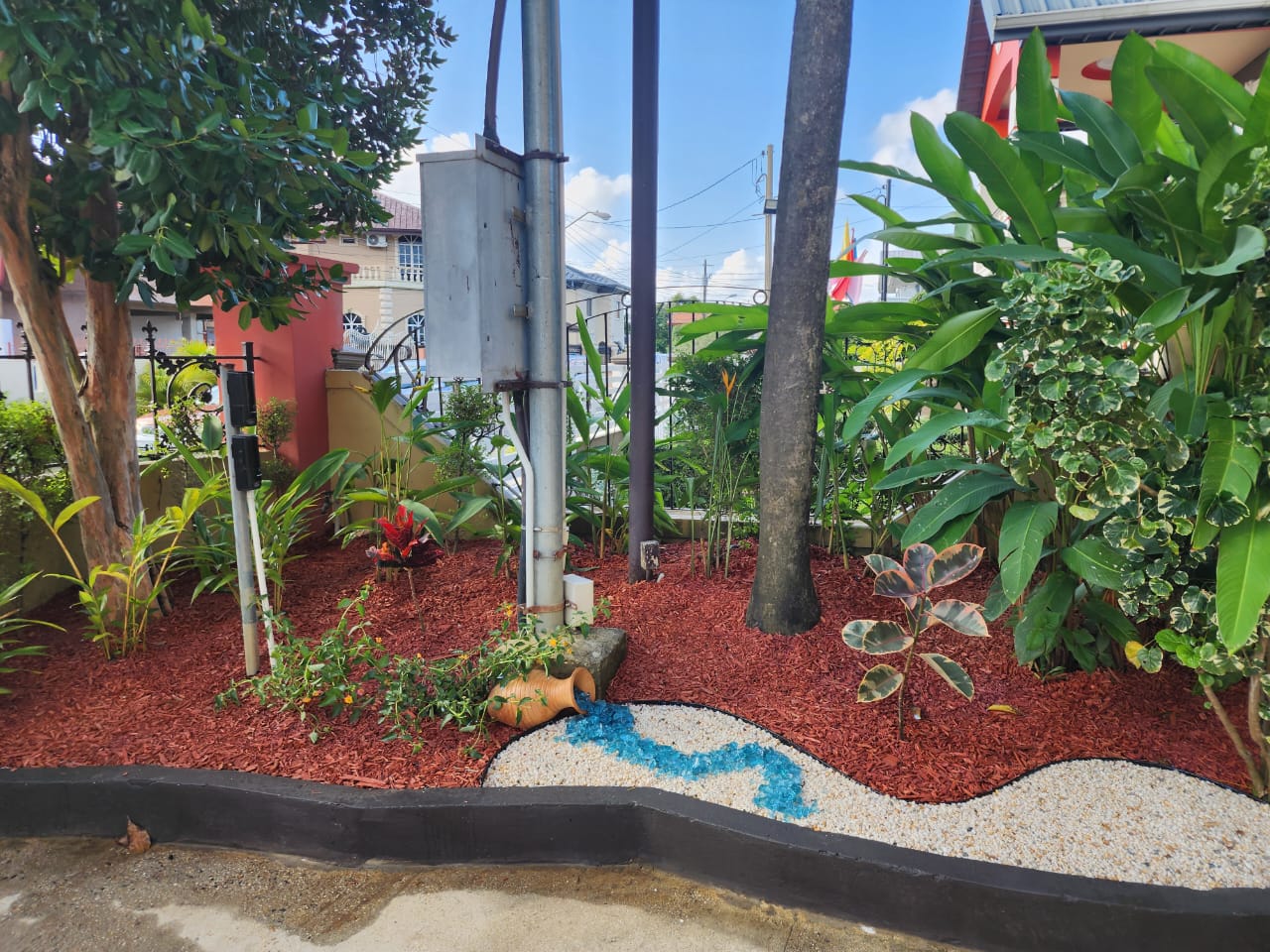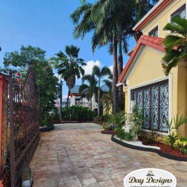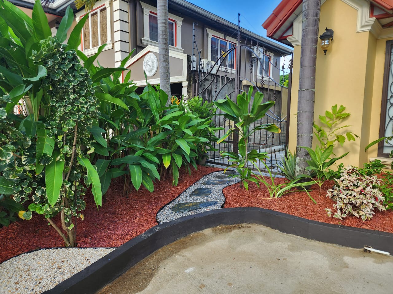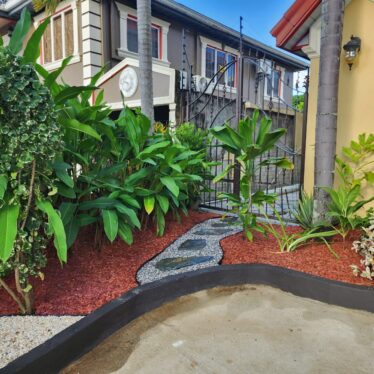 This landscape installation transforms the outdoor space into a clean, modern, and calming retreat designed for both beauty and low maintenance. The layout is thoughtfully structured with defined walkways and layered textures, blending hardscape elements with lush tropical planting.
