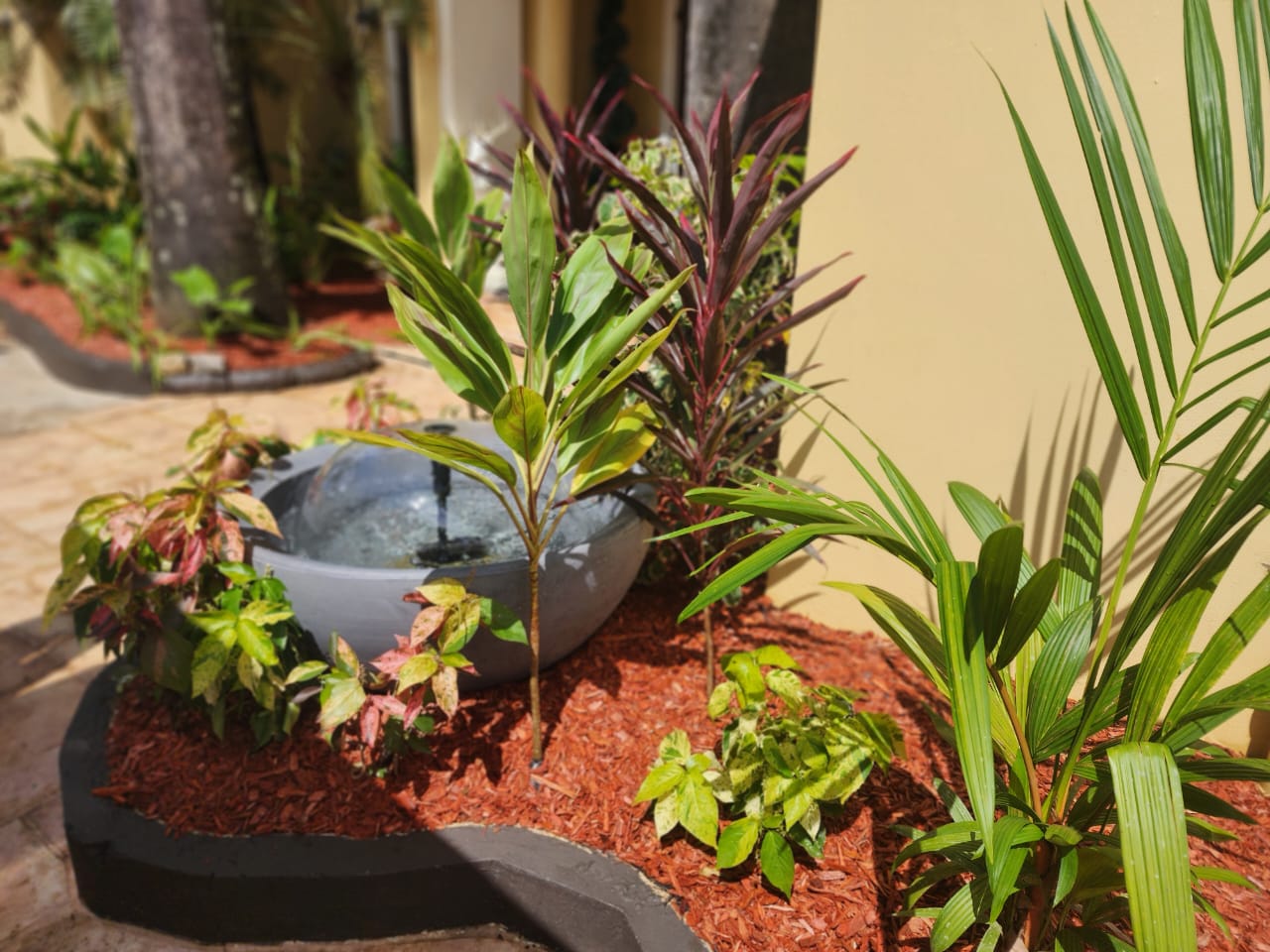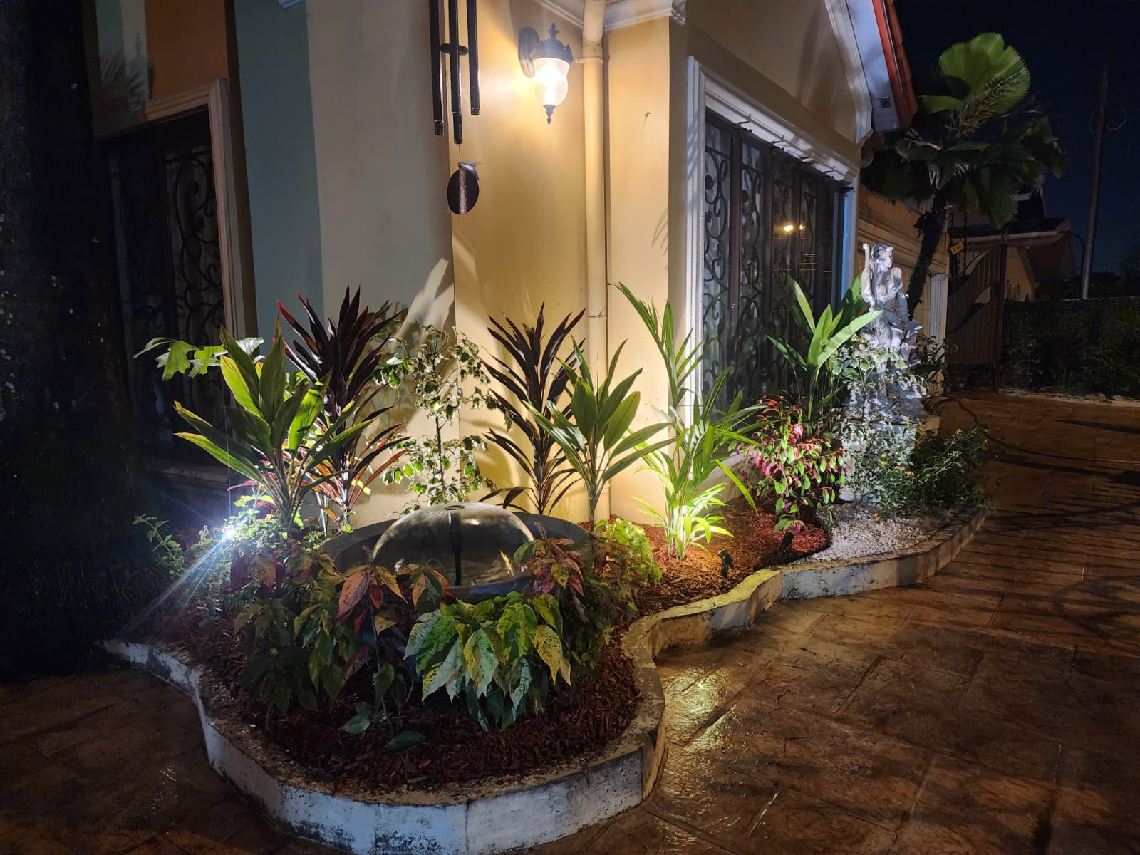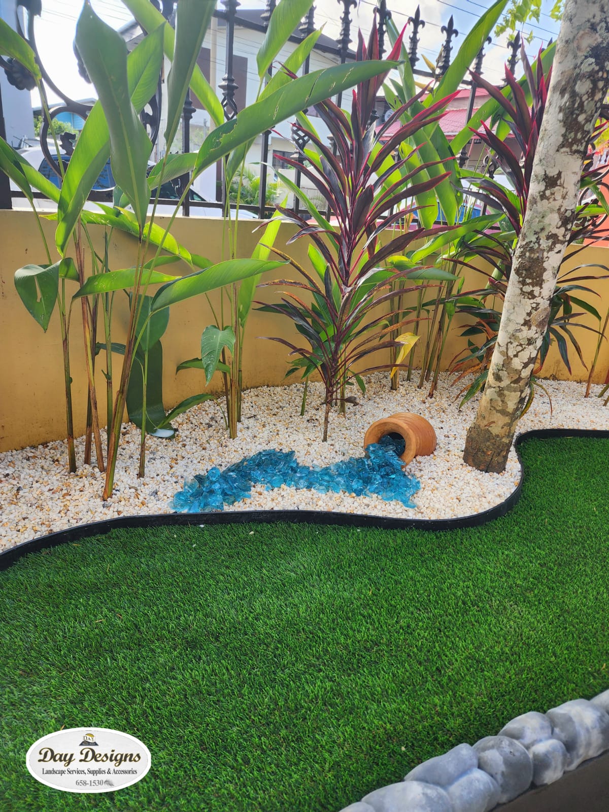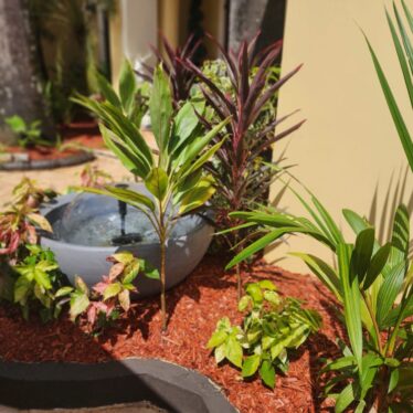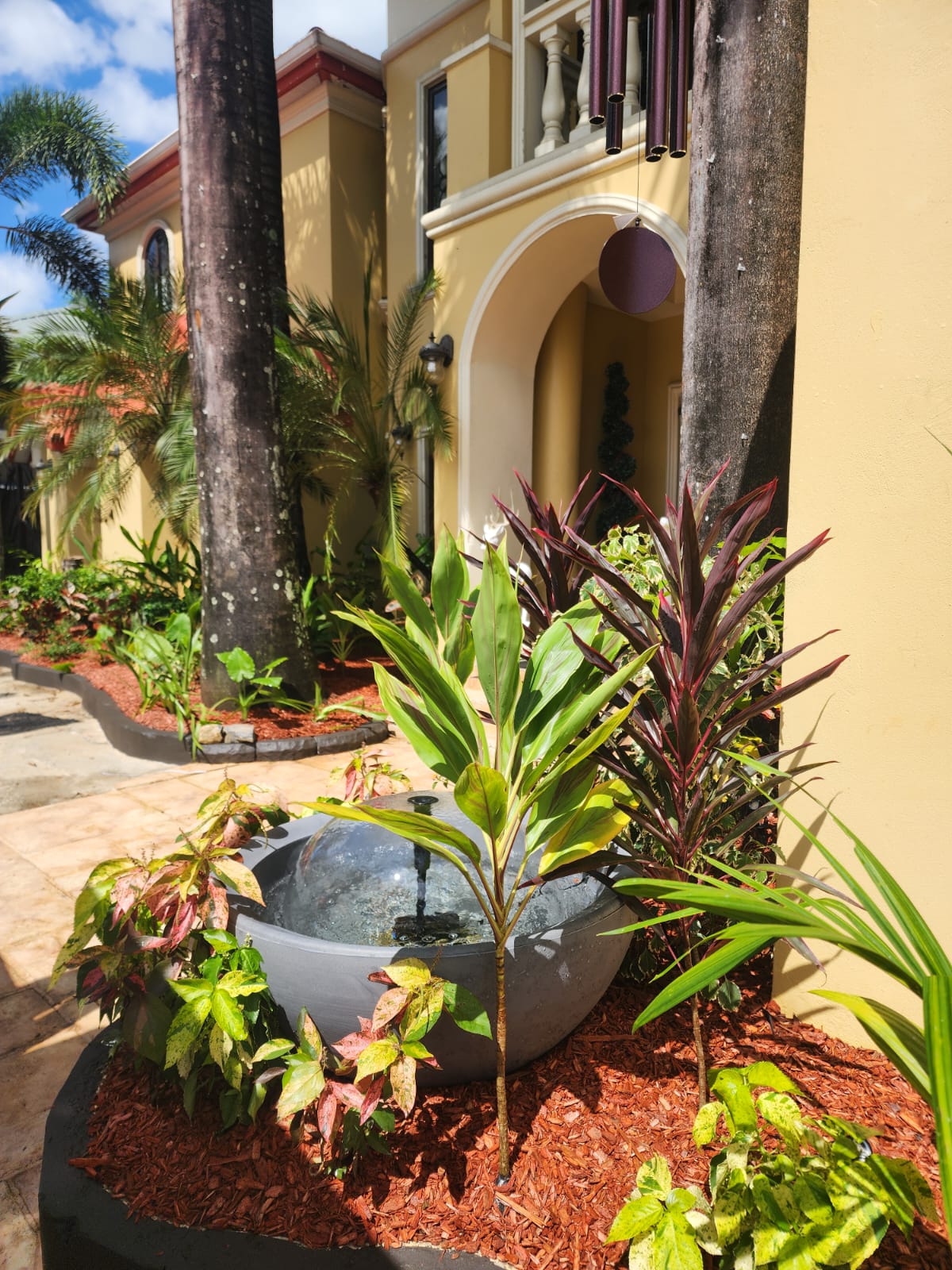 This landscape installation transforms the outdoor space into a clean, modern, and calming retreat designed for both beauty and low maintenance. The layout is thoughtfully structured with defined walkways and layered textures, blending hardscape elements with lush tropical planting.