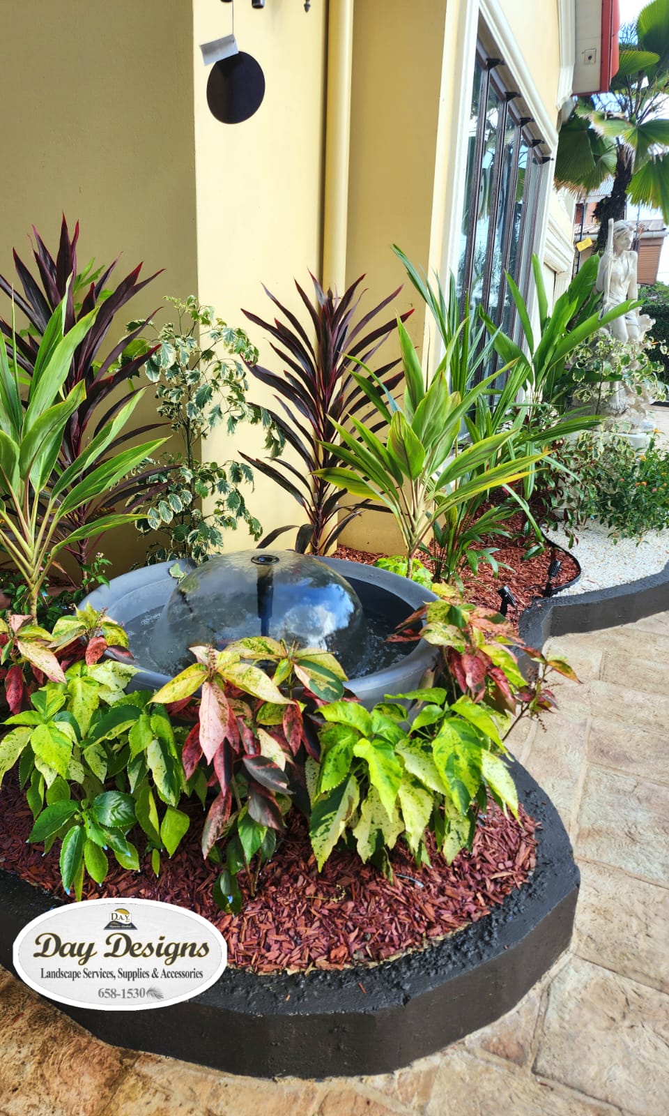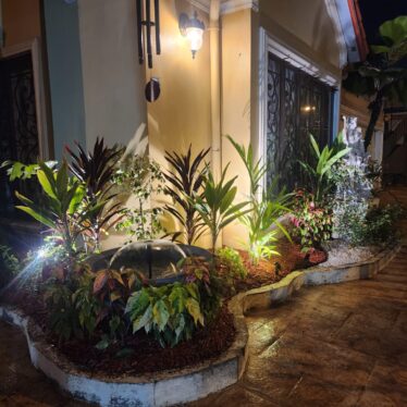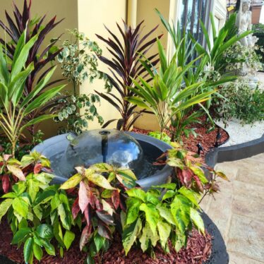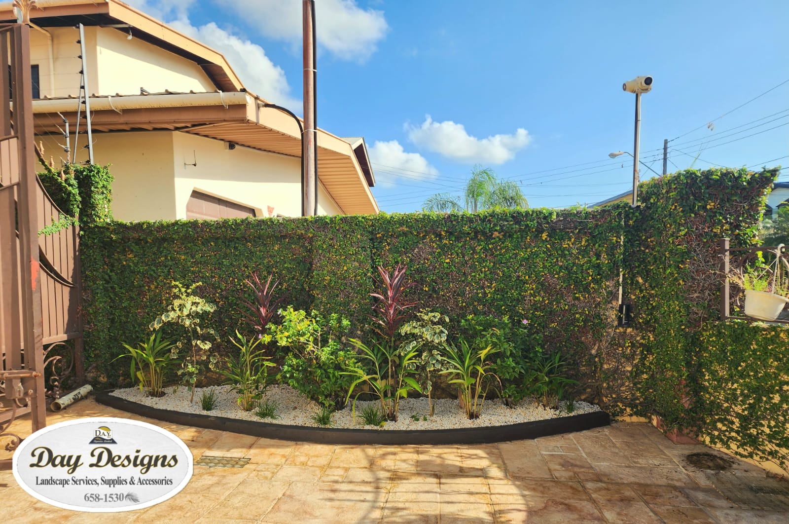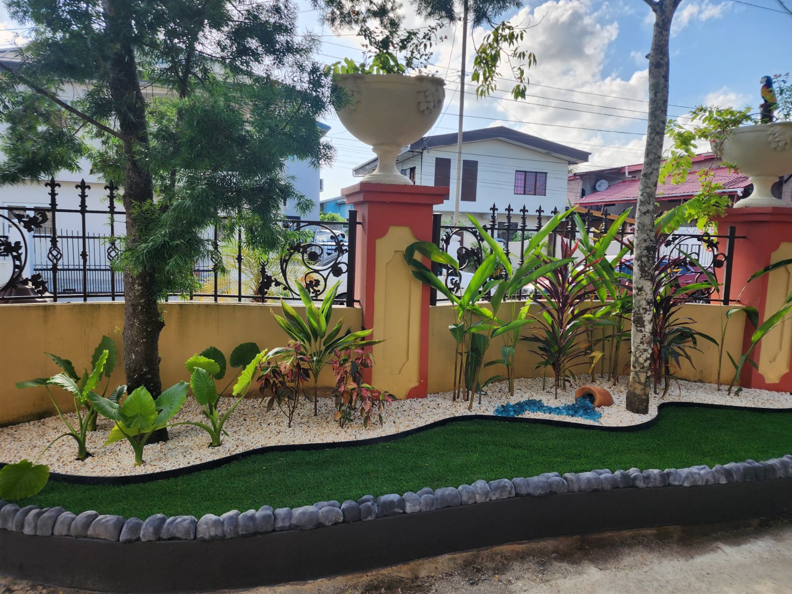 This landscape installation transforms the outdoor space into a clean, modern, and calming retreat designed for both beauty and low maintenance. The layout is thoughtfully structured with defined walkways and layered textures, blending hardscape elements with lush tropical planting.