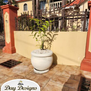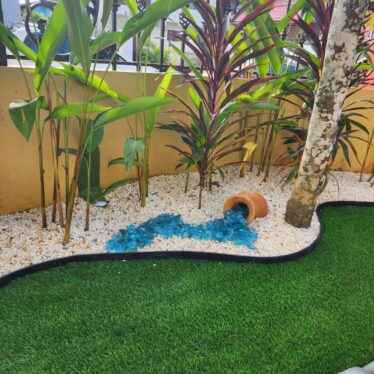 Decorative aggregates and pebbles provide contrast and visual flow, while strategically placed planters and greenery soften the space and add natural movement. Feature elements create focal points that draw the eye and enhance tranquility, making the area ideal for relaxation or entertaining.